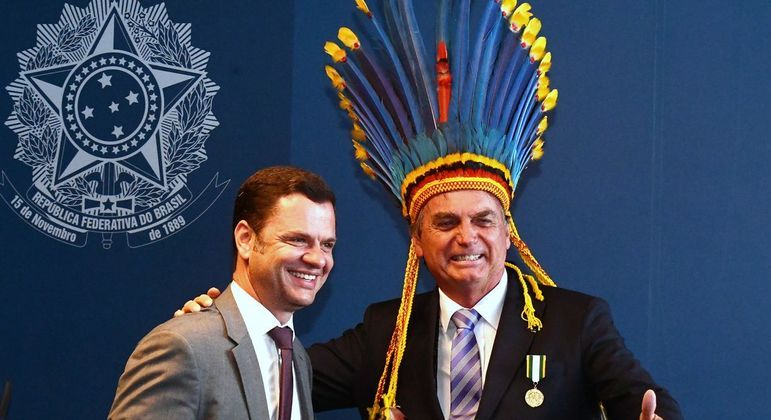 Presidente Jair Bolsonaro ao lado do ministro da Justiça, Anderson Torres, durante evento do Mérito Indigenista